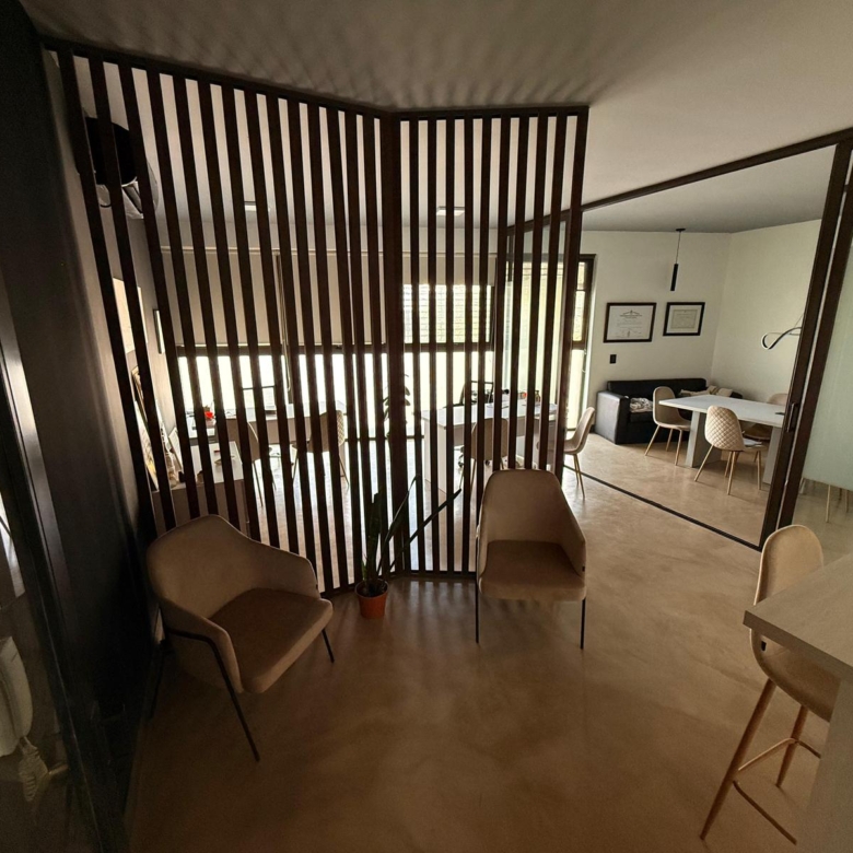 Tabique de listones de madera que separa sectores sin cerrar el ambiente.