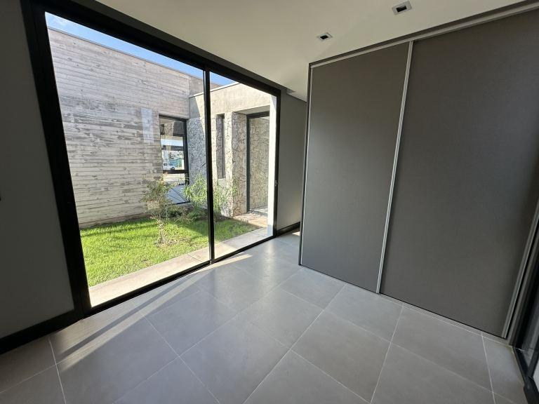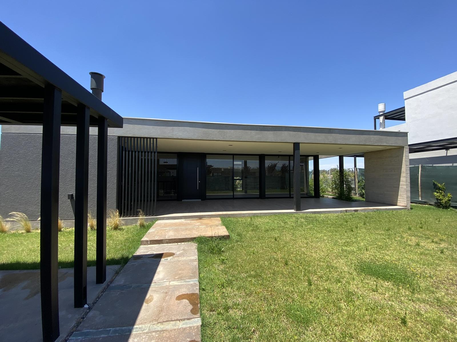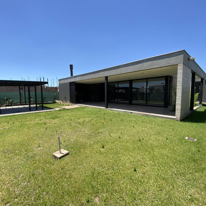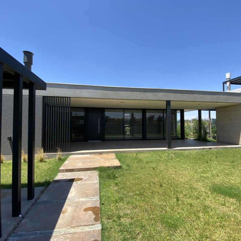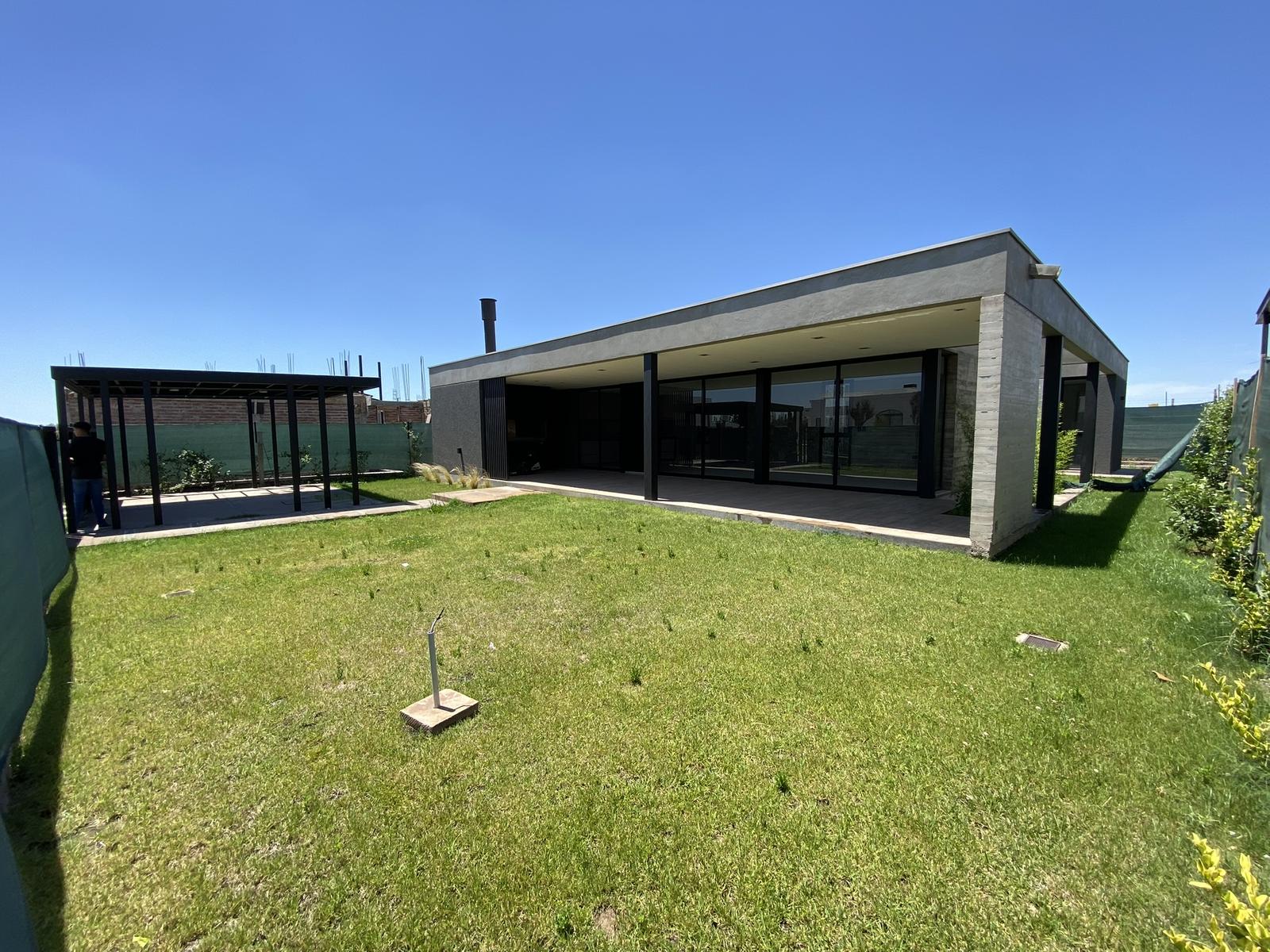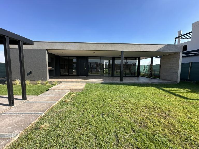 La casa se ubica en el lote 35 de la Manzana A, cuenta con un proyecto minimalista con detalles en piedra mucha visual de su jardin construida de una planta, que cuenta con un amplio estar comedor , cocina con amoblamiento, lavadero separado, toilette, patio tendedero, 3 dormitorios con placares, el principal con vestidor y en suite, y un tercer baño para los otros dos dormitorios, posee galería al mismo nivel de piso que el estar para permitir al abrir sus aberturas comunicar los dos espacios, estos ambientes poseen vista al jardín y cuenta con una cochera para dos vehículos a la par.