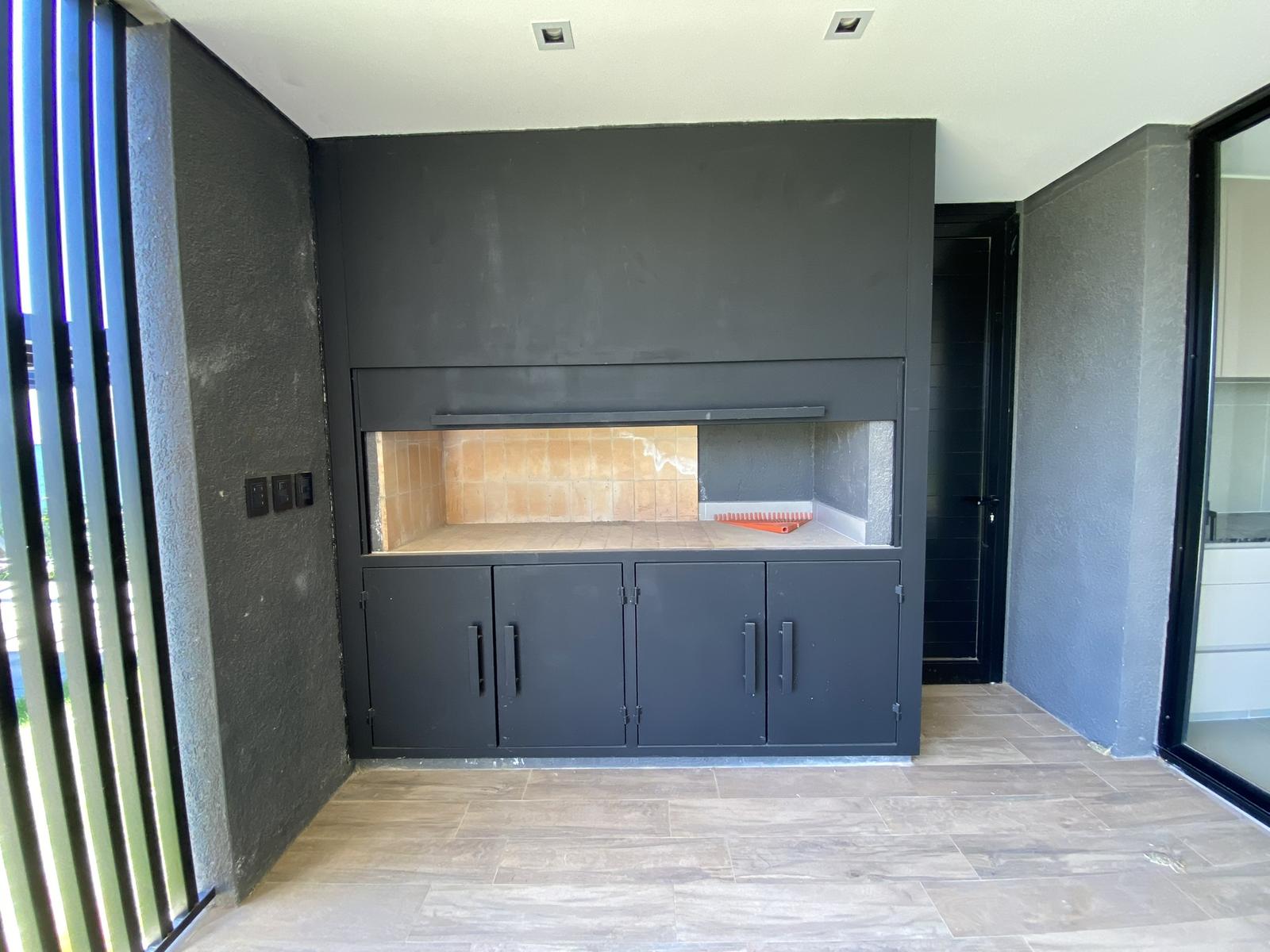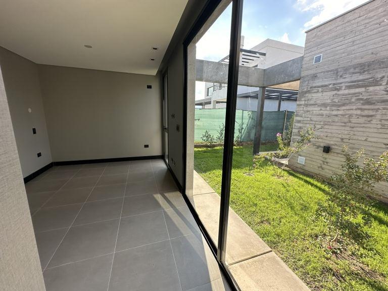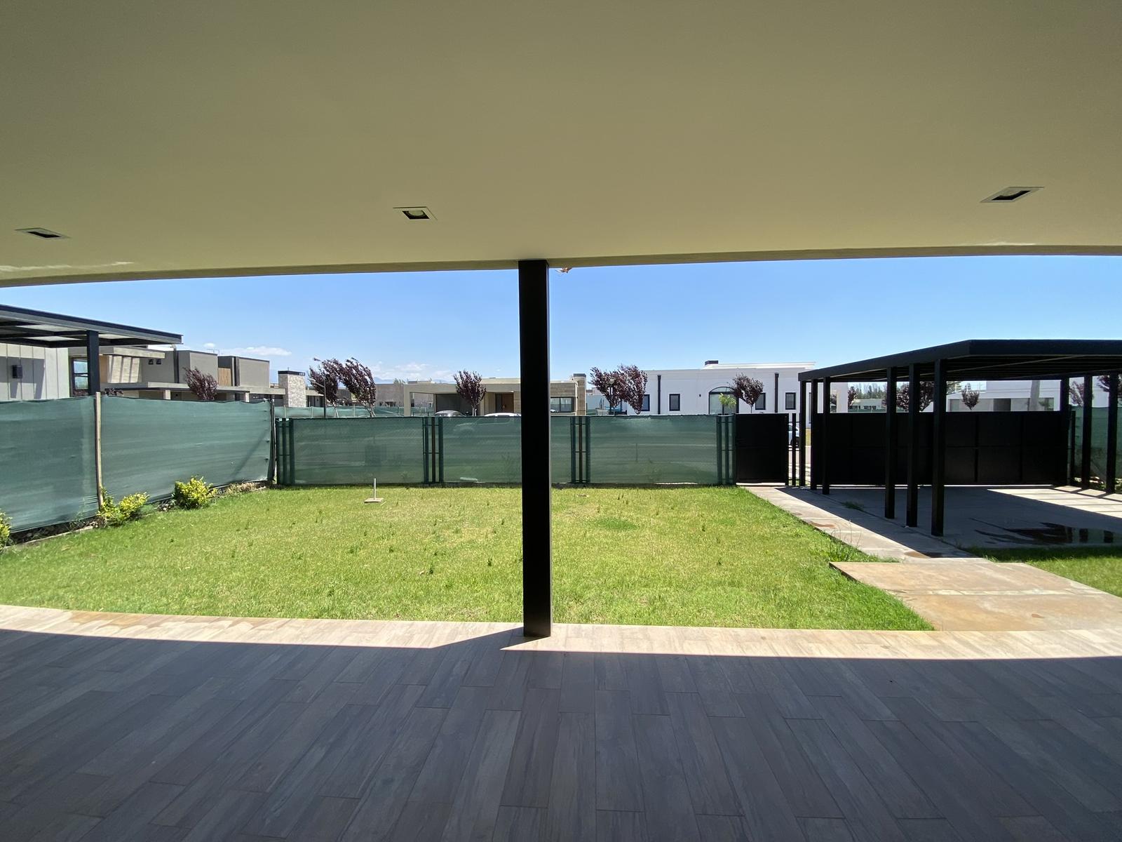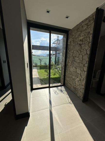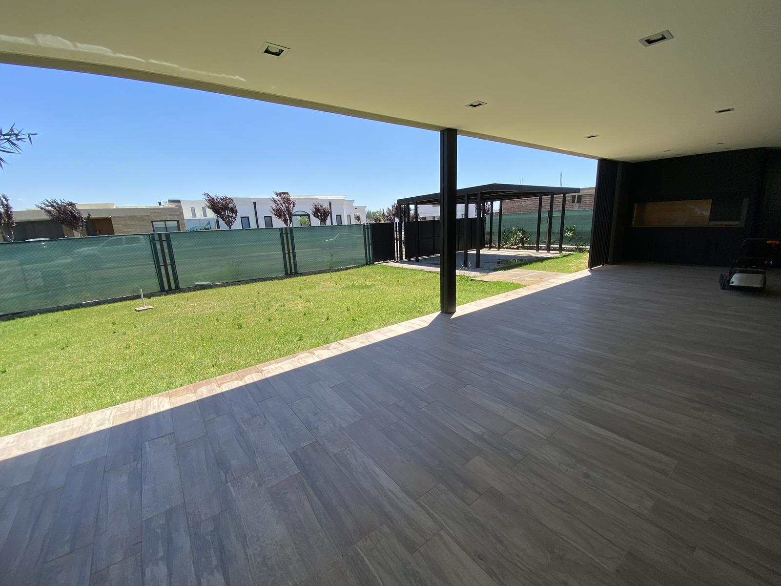 La casa se ubica en el lote 35 de la Manzana A, cuenta con un proyecto minimalista con detalles en piedra mucha visual de su jardin construida de una planta, que cuenta con un amplio estar comedor , cocina con amoblamiento, lavadero separado, toilette, patio tendedero, 3 dormitorios con placares, el principal con vestidor y en suite, y un tercer baño para los otros dos dormitorios, posee galería al mismo nivel de piso que el estar para permitir al abrir sus aberturas comunicar los dos espacios, estos ambientes poseen vista al jardín y cuenta con una cochera para dos vehículos a la par.