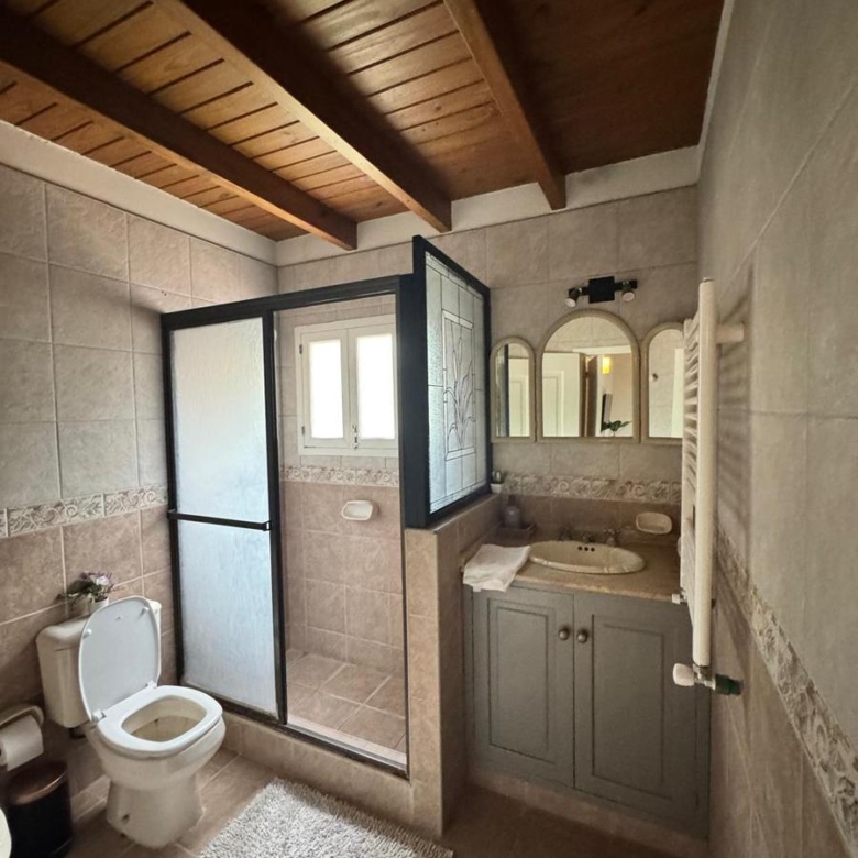La casa se desarrolla en una planta sobre un terreno de 1030 m2. ubicado en callejón privado con portón automatizado en el ingreso. Consta de un amplio living comedor con hogar a leña. El mismo cuenta con ventanales que permiten ingreso de luz natural y salida a la galería. Cocina independiente con desayunador y amoblamiento de alacena y bajo mesada. Lavadero independiente Baño completo. Tres dormitorios, dos con placares y el dormitorio principal con baño en suite y vestidor.