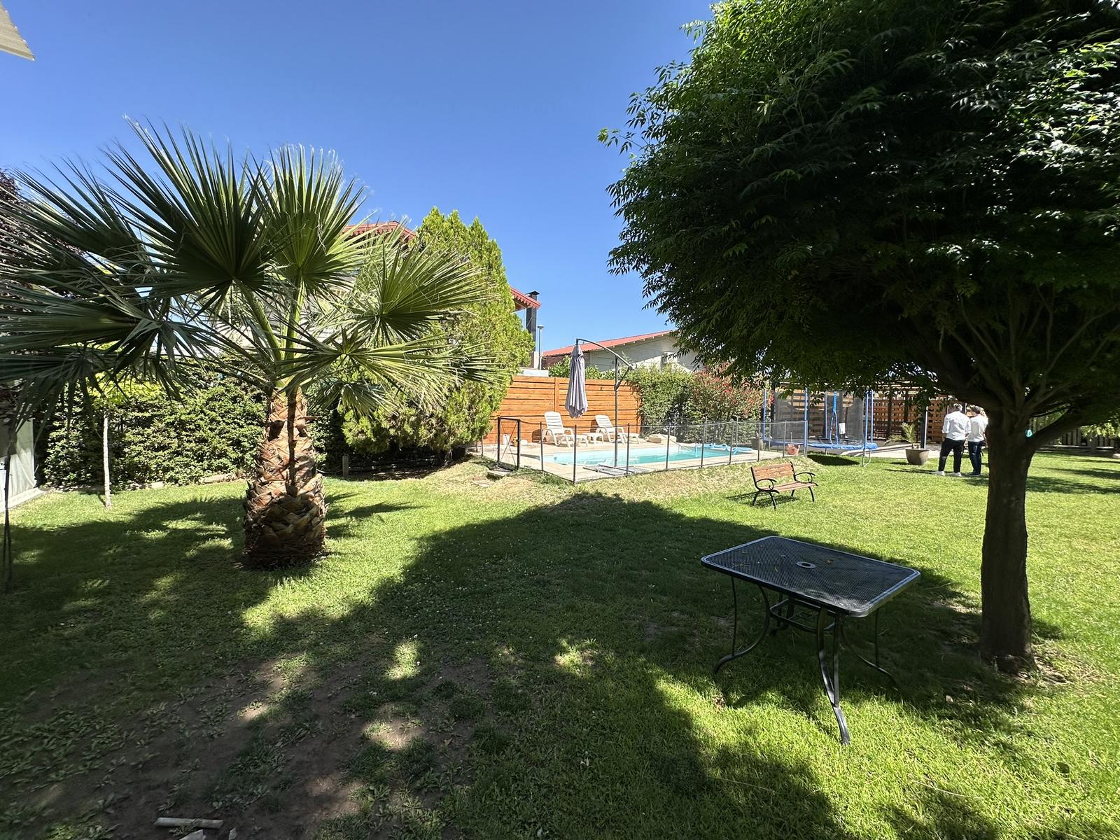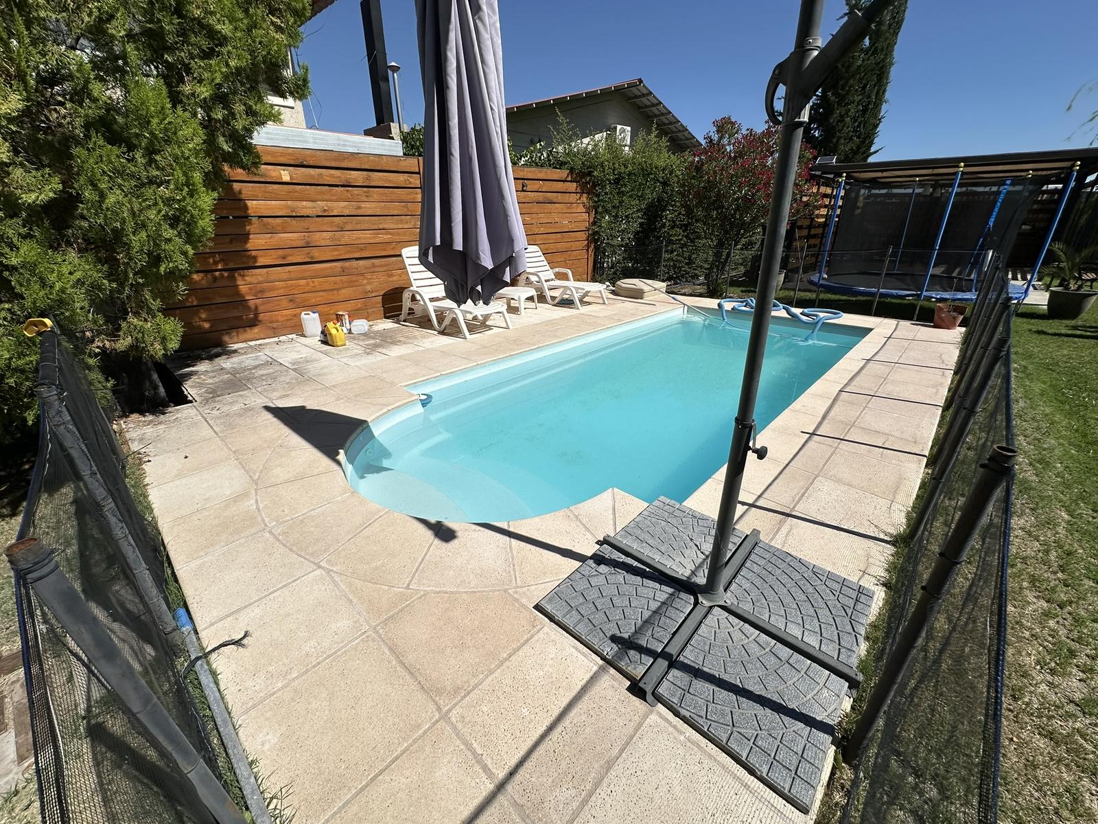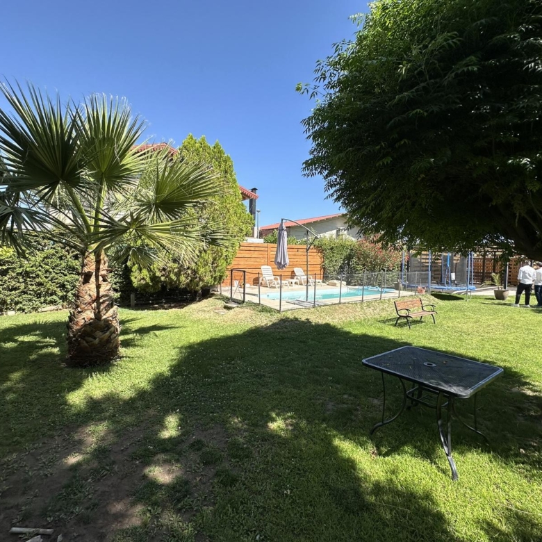 Un jardín de dimensiones generosas con pileta, diseñado para disfrutar el clima de Mendoza.
